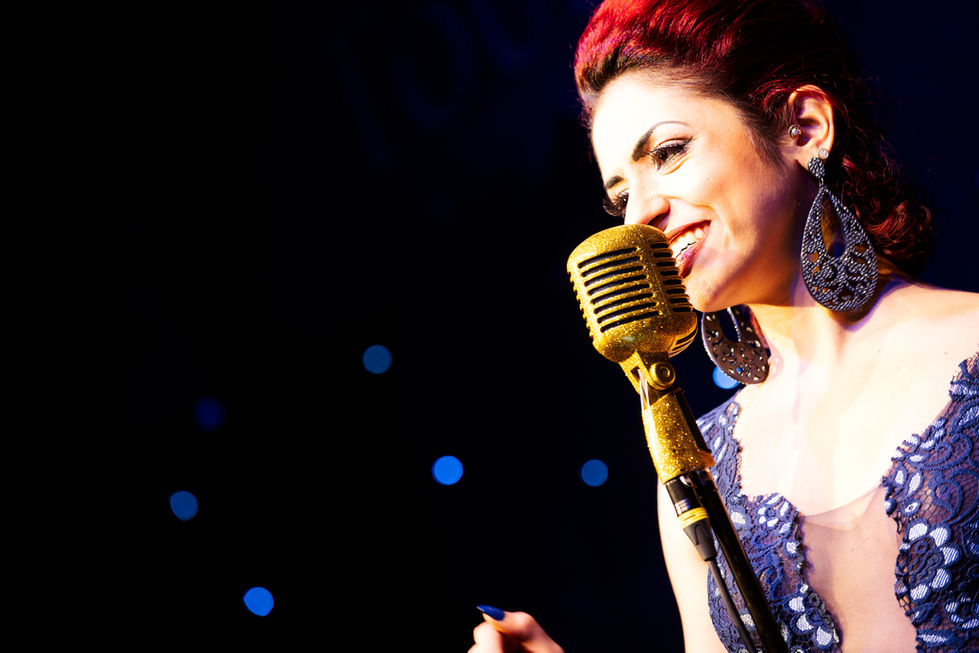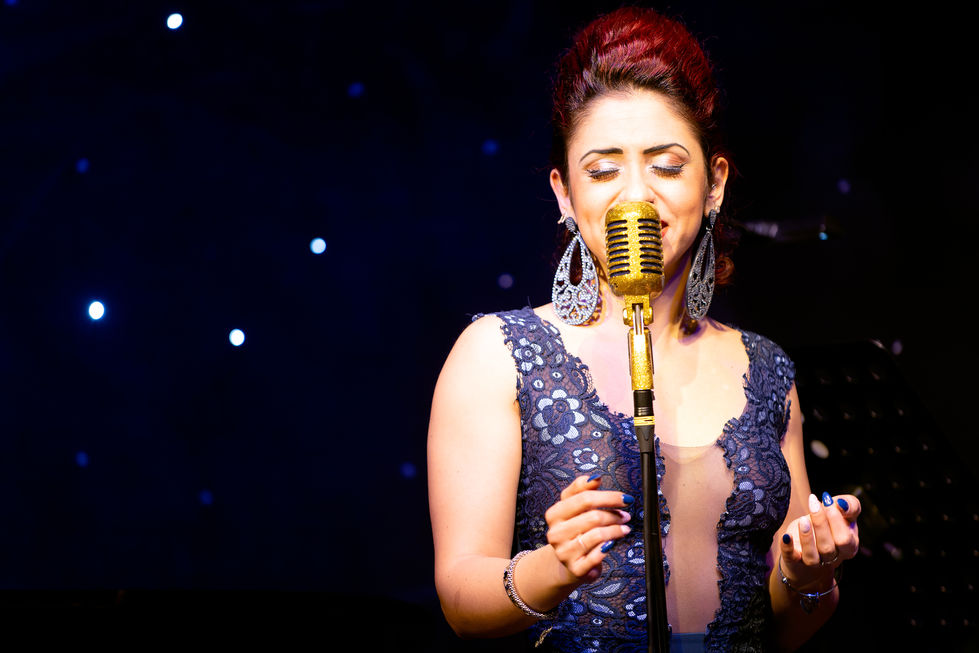 Capturing the energy and passion of live music performances, featuring AnnA as singer and pianist and musicians on stage, with vintage microphones and colorful stage lighting.